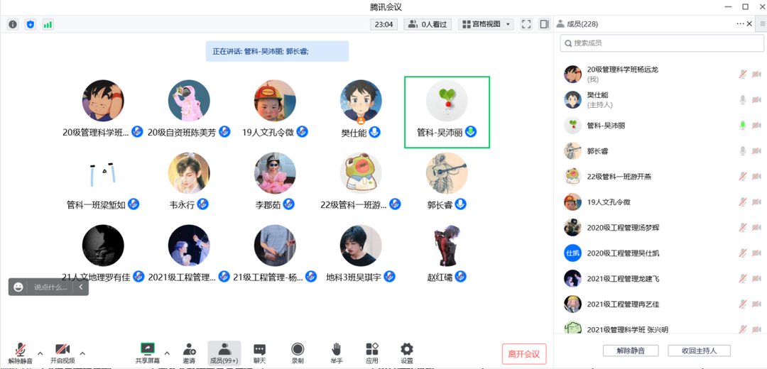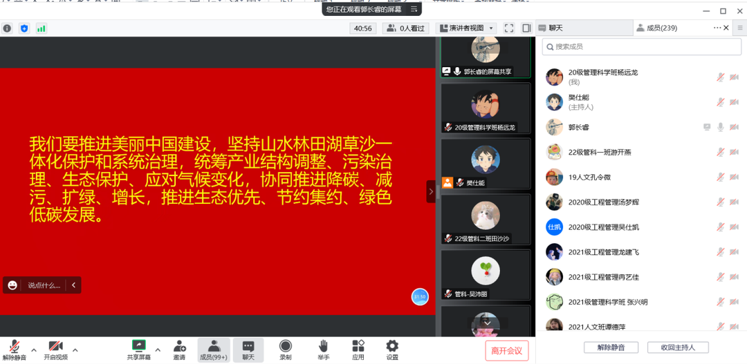 郭长睿向同学们介绍了共青团100年来的使命,同时联系当下讲到新时代团员青年的时代担当,勉励青年团员们要有新时代青年的朝气和抱负,向着未来进发。郭长睿就习近平总书记在二十大报告中提出的“推动绿色发展,促进人与自然和谐共生”这部分内容,联系管科公司的专业,如人文地理与城乡规划、农村区域发展等,启发同学们可以利用所学的专业知识在“坚持山水林田湖草沙一体化保护和系统治理,统筹产业结构调整、污染治理、生态保护、应对气候变化,协同推进降碳、减污、扩绿、增长,推进生态优先、节约集约、绿色低碳发展”这些方面有所作为。郭长睿希望同学们好好学习相关专业知识,在推进美丽中国建设、建设现代化产业体系中贡献自己的力量。