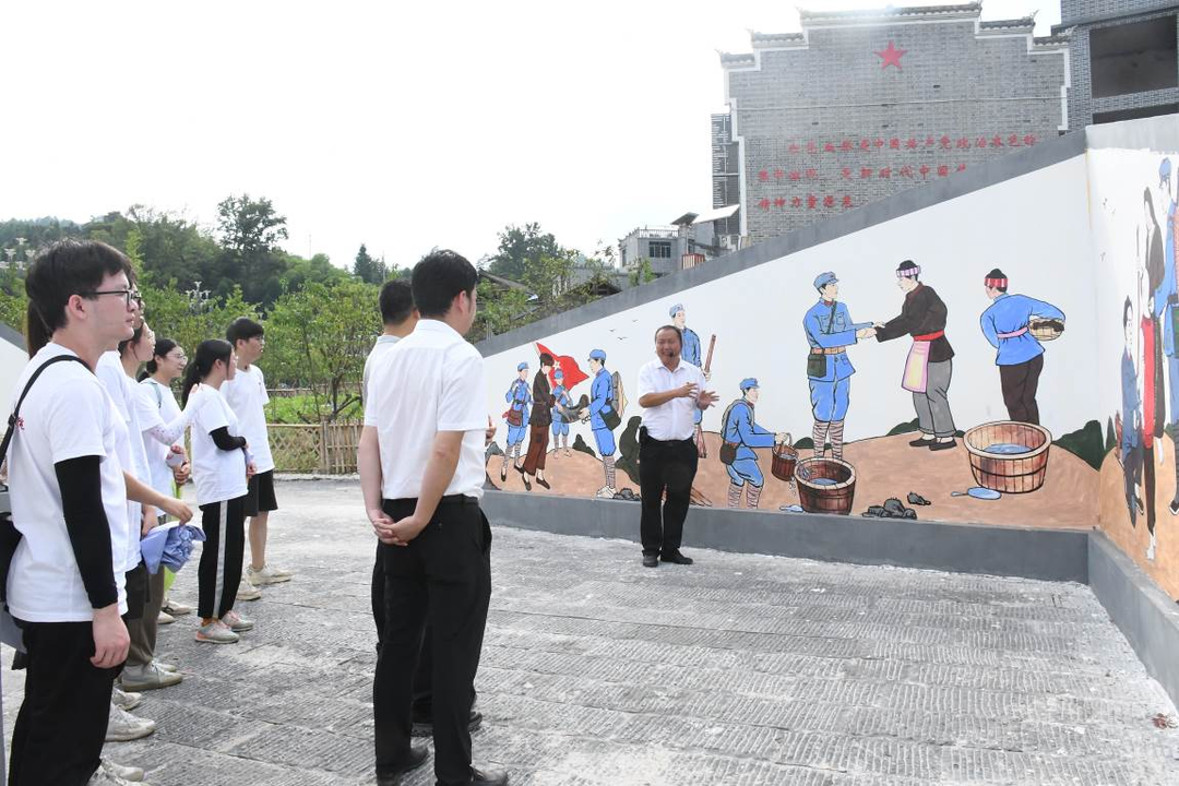 实践团来到偏寨村,偏寨村刘支书以交流式讲解的方式,向实践团成员们讲述了在二万五千里红军长征中,红军曾经于1934年12月转战台江,留下了许多宝贵的革命遗迹。为更好的传承红色文化,学习红色精神,实践团成员以自已的口吻转化角度讲述偏寨村的红色故事。