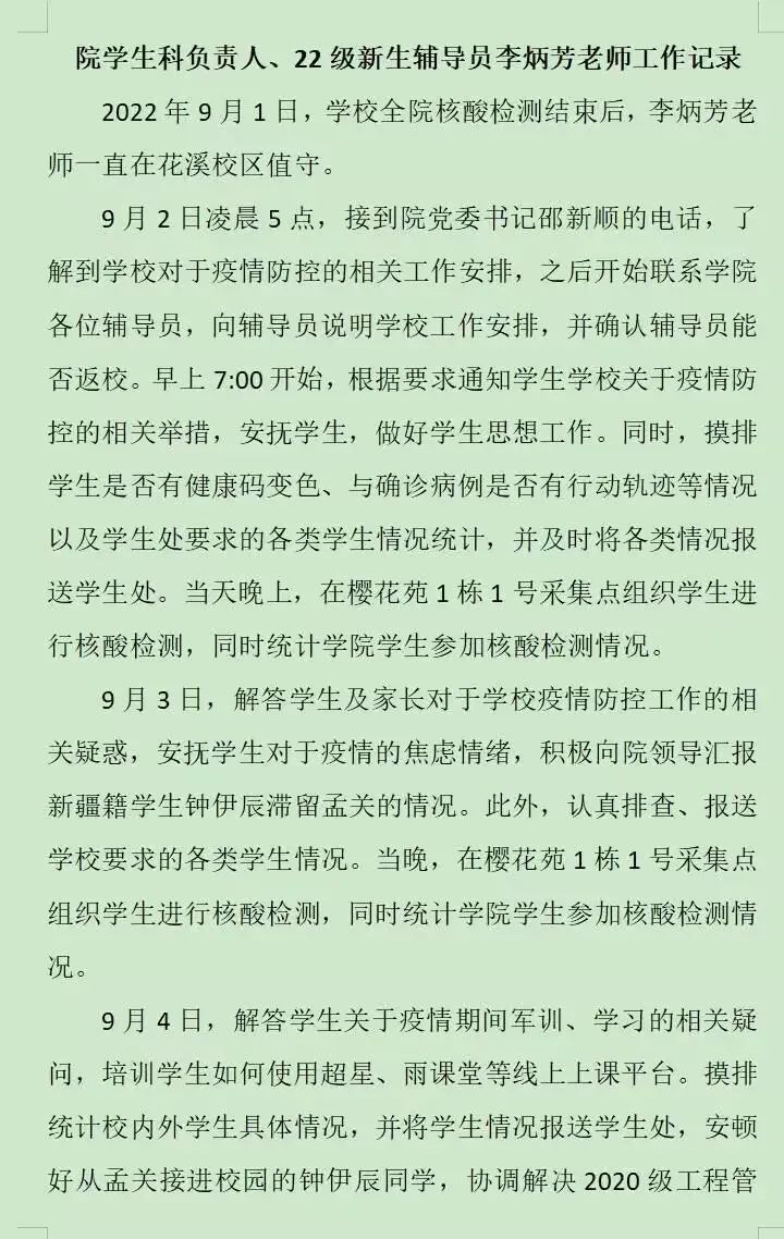 志愿者王玲玲:我主要组织好点位上的志愿者工作分工,引导同学扫健康码、登记宿舍信息、扫码提交核酸检测信息、维持秩序等服务。作为一名预备党员,作为当代在校老员工,我们的身上有着无法丢弃的责任与使命。每次做核酸,一站就是四五个小时,反复地粘贴撕扯条形码,面对成百上千的员工,反复对大家告知注意事项,大家嗓音嘶哑依旧在坚持,做完核酸后还要反复核对核酸检测人员名单,确保万无一失。当我们身在其中的时候才明白,当我们奉献自己的一份力量的时候,在奉献与劳动中,找到了自己的价值,并且成长起来。