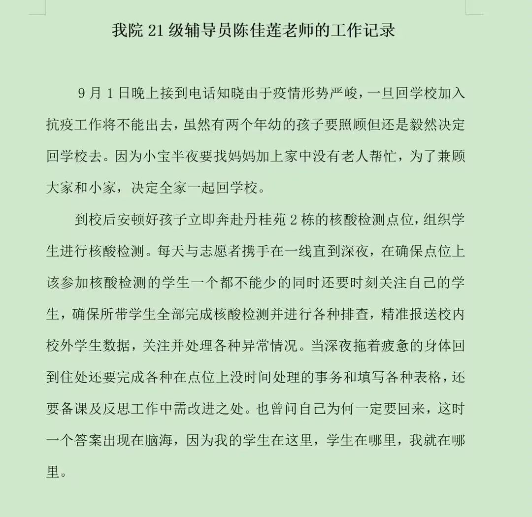 从投入到这场疫情防控阻击战中,公司的领导老师们以他们的实际行动给我们管科学子展示了什么是奉献、什么是责任、什么是担当。公司党委书记邵新顺每天只睡两三个小时,公司的年轻老师让他多休息时,他嘴边总是挂着那句“没事,你们不用担心,你们小年轻也注意身体”;已调往招就处但仍在履行员工管理职责的原党委副书记王茜,现在仍尽职尽责的和大家一起战斗,并经常给大家带来鼓励温暖,她说过一句话“虽然已经下文我现在不在管科,但是交接工作的最后阶段我仍然要站好最后一班岗,做好自己该做的,有始有终,而且,我对管科也很有感情”;几位辅导员老师家里都是两三岁的孩子,但是他们暂时“放弃”了她们的小孩子,去保护好他们的“大孩子们”。
