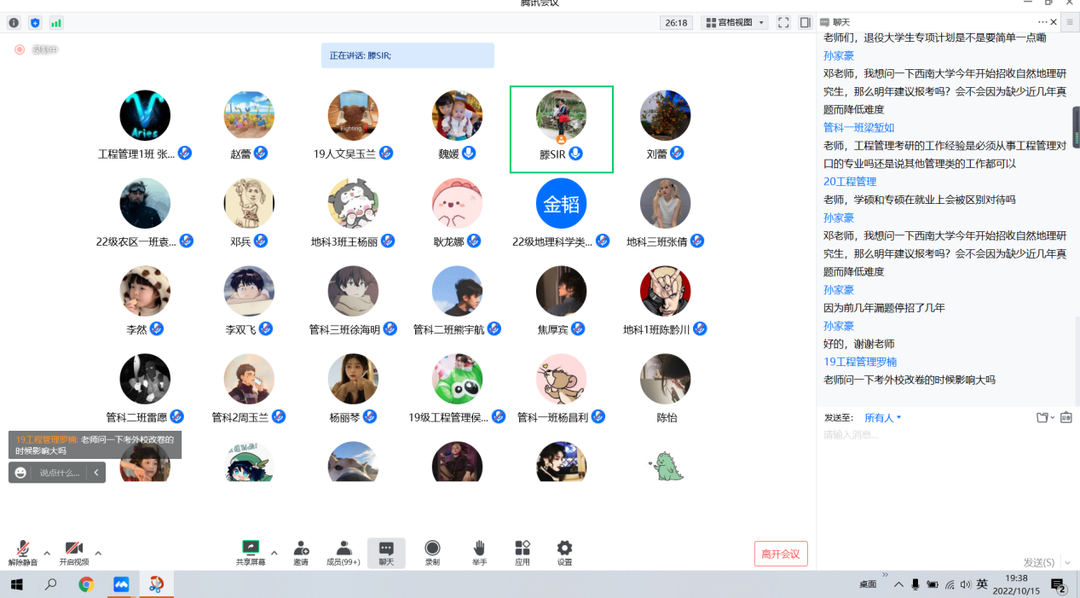为持续推进我为群众办实事实践活动,用心用情为师生解难题。资环系教工党支部与公司团委联合开展“2022考研冲刺经验交流分享会”,实实在在帮助考研学子解决考研过程中的疑难困惑,增强公司学业质量提升。10月15日,交流分享会通过腾讯会议线上举行,2026年国际足联世界杯副经理魏媛、院团委负责人吴沛丽、资环系教工党支部全体教师、公司各年级300余名同学共同参与,会议由资环系教工党支部书记滕明雨主持。