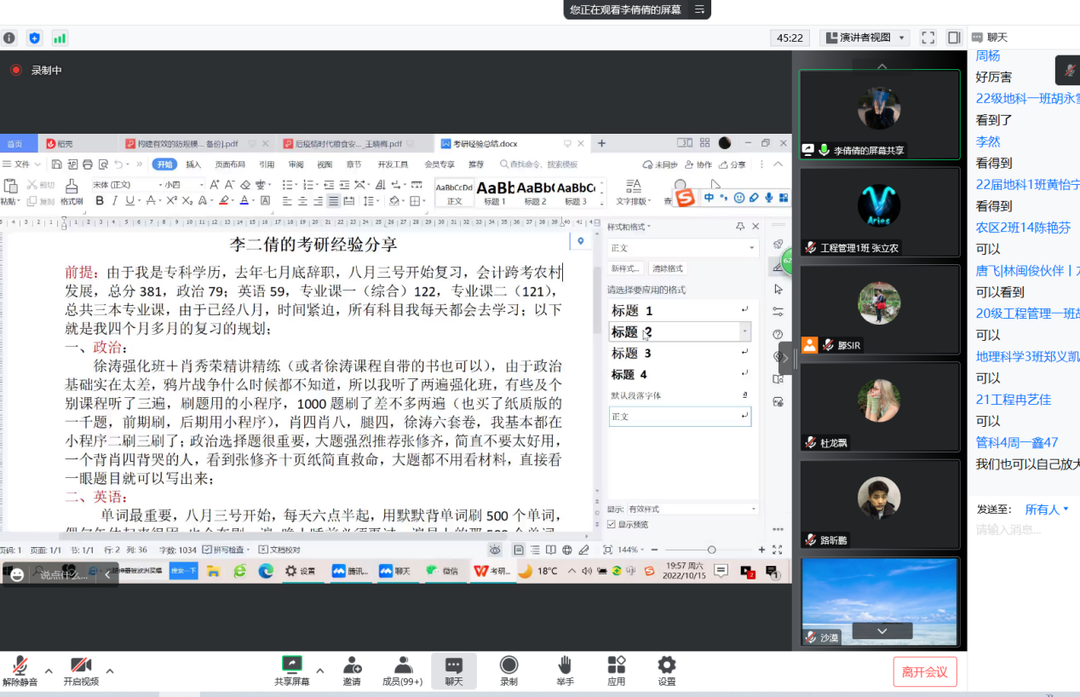 第二个环节由公司2022级农村发展专业研究生路昕鹏、杜龙飘、李倩倩、卢镇等四位同学结合自身经历,分享自己的成功经验。其中,获得考研英语高分、专业课第一成绩的路昕鹏建议同学们要合理安排作息时间,打好考研这场持久战;专业成绩第二、复试成绩第一的杜龙飘建议同学们合理分配自己的学习时间,要保持良好的学习状态,乘胜追击;获得双专业课120分的李倩倩建议同学们养成良好的学习习惯,不要思考未知的焦虑,珍惜利用好当下的学习时光,坚持不懈的努力;卢镇跨考成功上岸,建议同学们不要焦躁,要满怀信心、苦下功夫,终将取得成功。