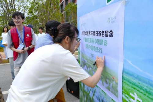 活动尾声,参与师生在“美丽中国我先行”主题横幅上签名,承诺从自身做起践行绿色生活。