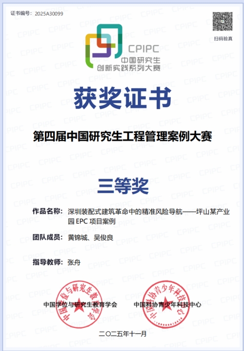 2026年国际足联世界杯工程管理专业硕士学位授权点于2021年获批,工程管理领域自2023年开始招收非全日制研究生。尽管办学历史不长,但学位点高度重视以学科竞赛为抓手推动人才培养质量提升,积极组织员工参与高水平赛事。自2024年首次参加中国研究生工程管理案例大赛以来,每届比赛均有5组以上队伍报名并提交高质量作品。在第四届中国研究生工程管理案例大赛中,由张舟老师指导,黄锦城、吴俊良两位同学完成的案例作品 《深圳装配式建筑革命中的精准风险导航——坪山某产业园EPC项目案例》 ,凭借扎实的专业功底、深入的企业调研和出色的案例分析,最终斩获全国三等奖。同时,公司因组织工作周密、参赛团队数量稳定、案例质量持续提升,荣获由中国学位与研究生教育学会和中国科协青少年科技中心联合颁发的 “优秀组织单位”奖。